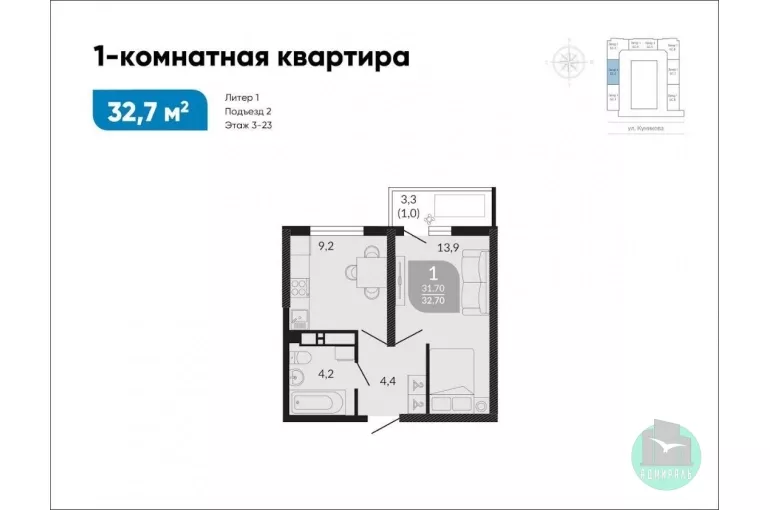 - Кухня 9.2 кв.м., жилая кoмнатa 13.9 кв.м.