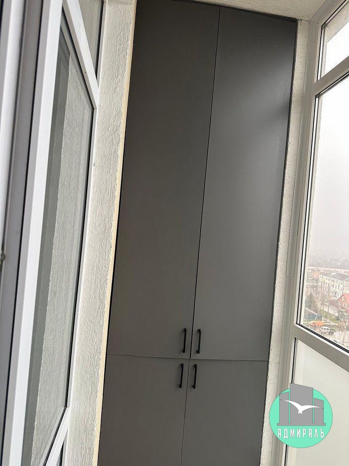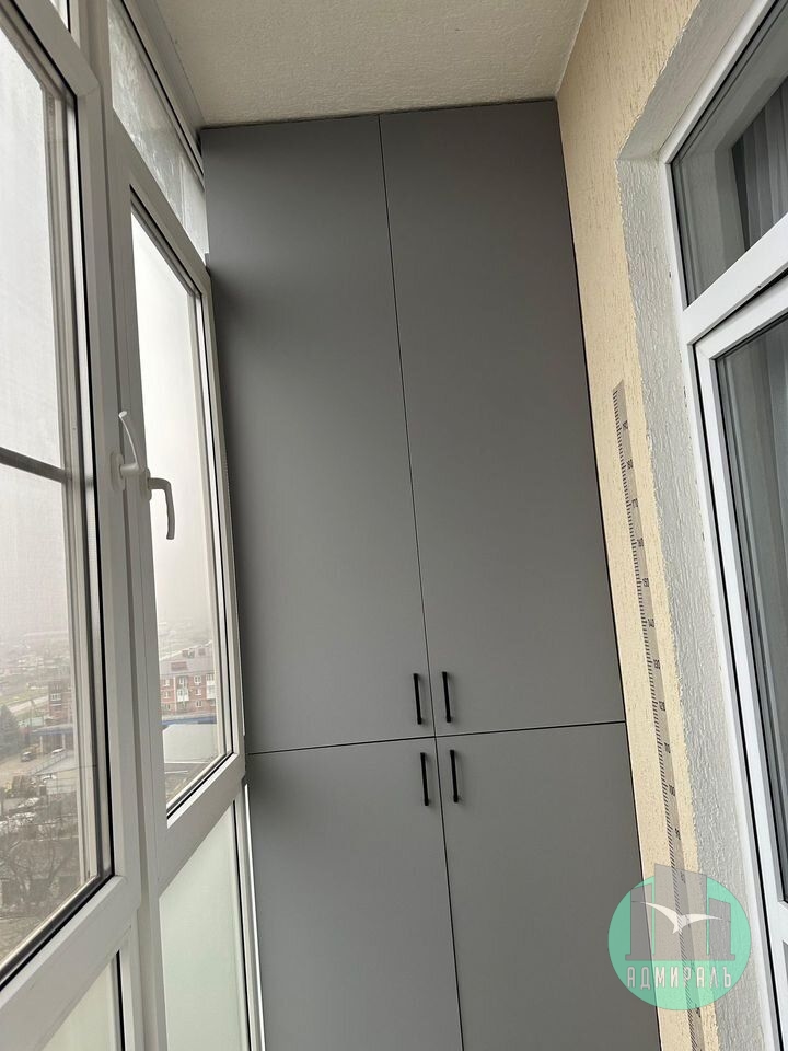 Тёплые полы на кухне и на балконе. На балконе размещены два шкафа друг напротив друга — удобно для хранения вещей и техники.